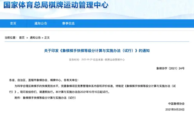 2021年全国象棋快棋锦标赛的诞生,将是象棋发展史上一个重要的里程碑。伴随着该项赛事,象棋快棋等级分应运而生。国庆前夕,中国象棋协会官方发布《象棋棋手快棋等级分计算与实施办法(试行)》,将于2021年10月15日起试行。