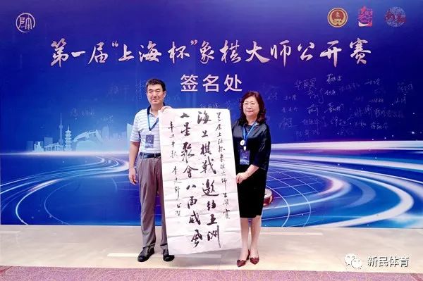 上海棋院院长单霞丽代表“上海杯”象棋大师公开赛组委会,接受上海大学李建新教授赠与的书法作品